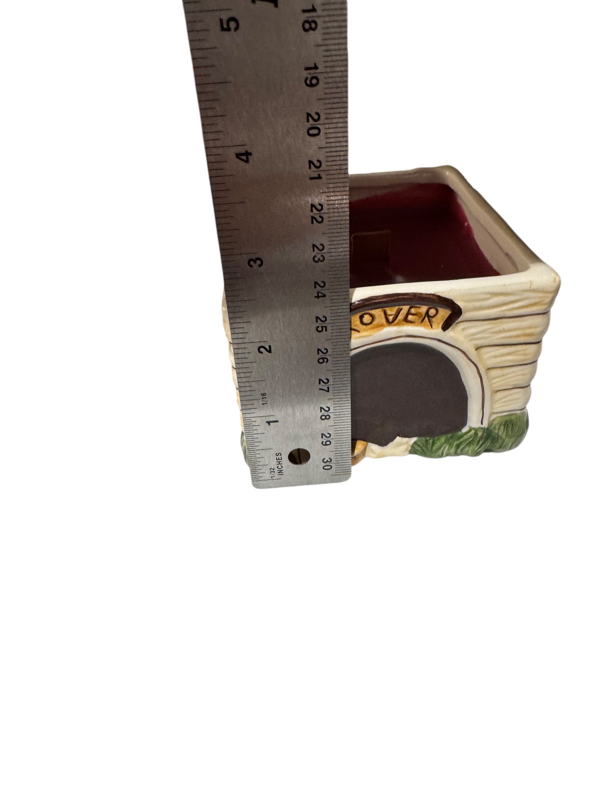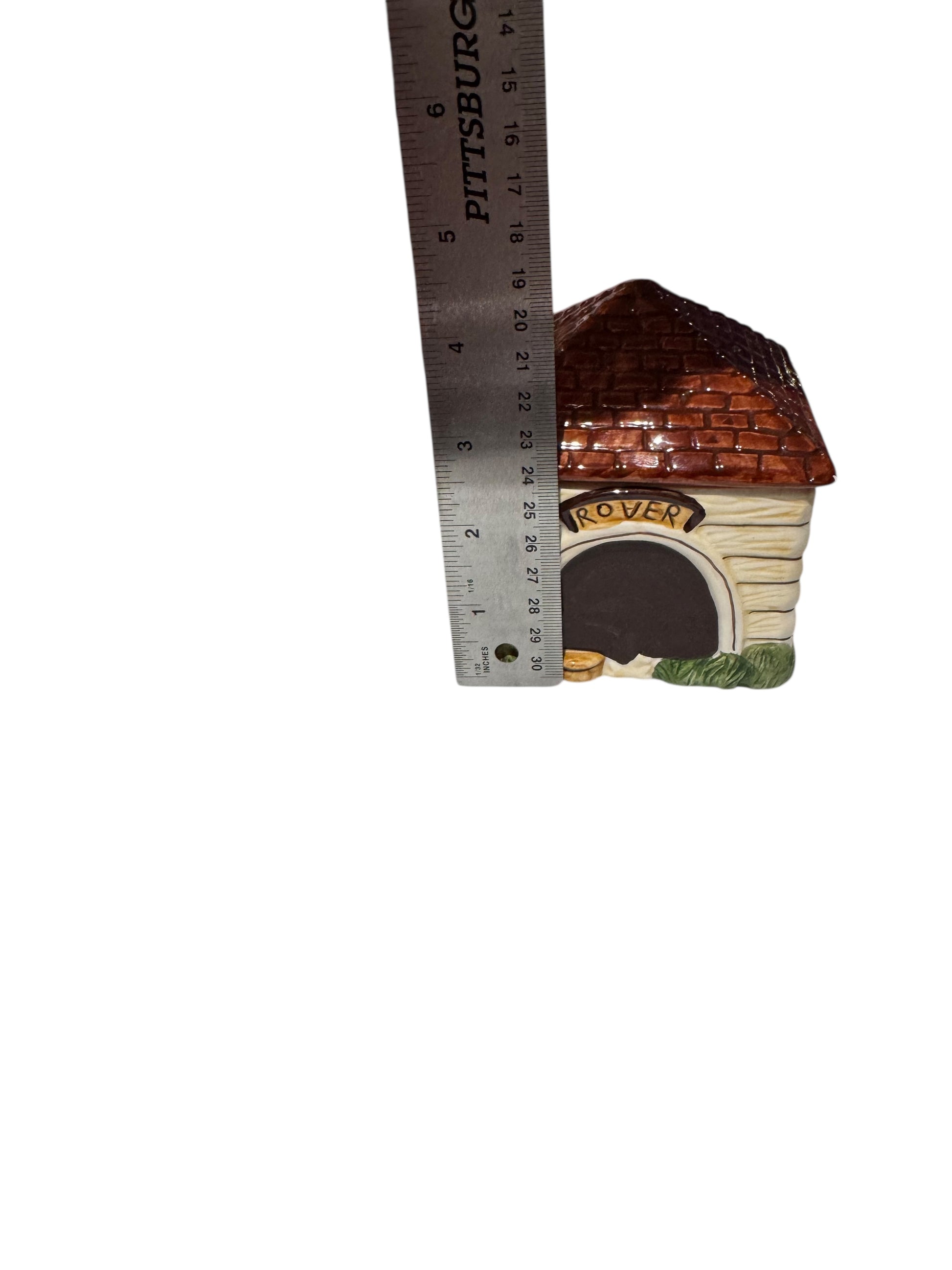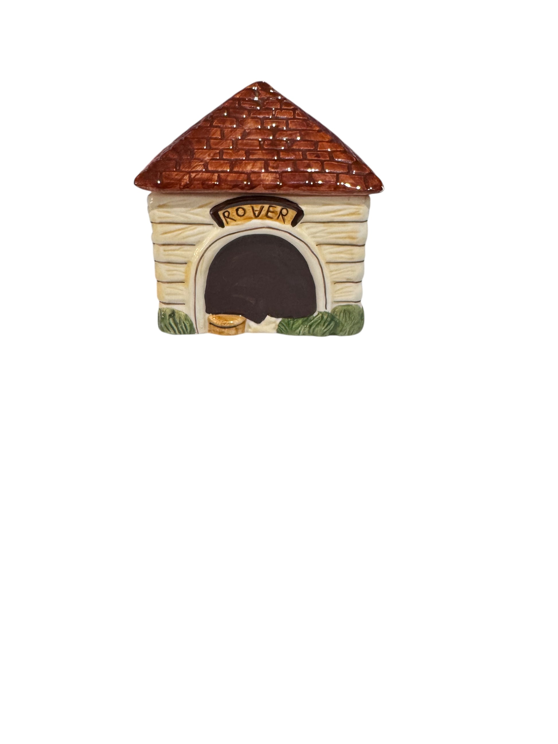 - CHARMING DESIGN: Vintage ceramic doghouse container with 'Rover' nameplate features a textured brick roof and cream-colored walls with decorative details for a nostalgic, whimsical display piece